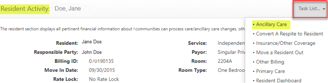 Step 3: Return to the resident’s Lease Management page and scroll down to the Resident Activity section of the page. a. Click the Task List menu, then select Ancillary Care.
