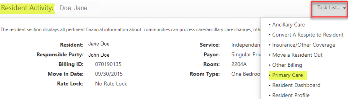 Step 1: On the resident’s Lease Management page, scroll down to the Resident Activity section of the page and click the Task List menu, then select Primary Care.