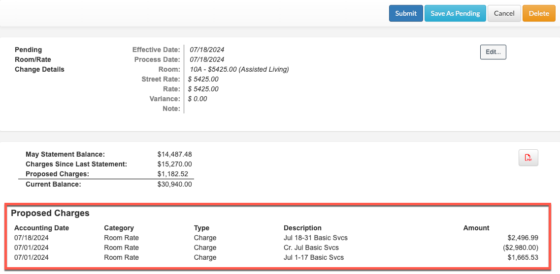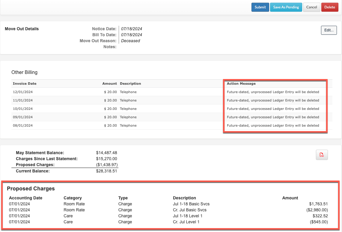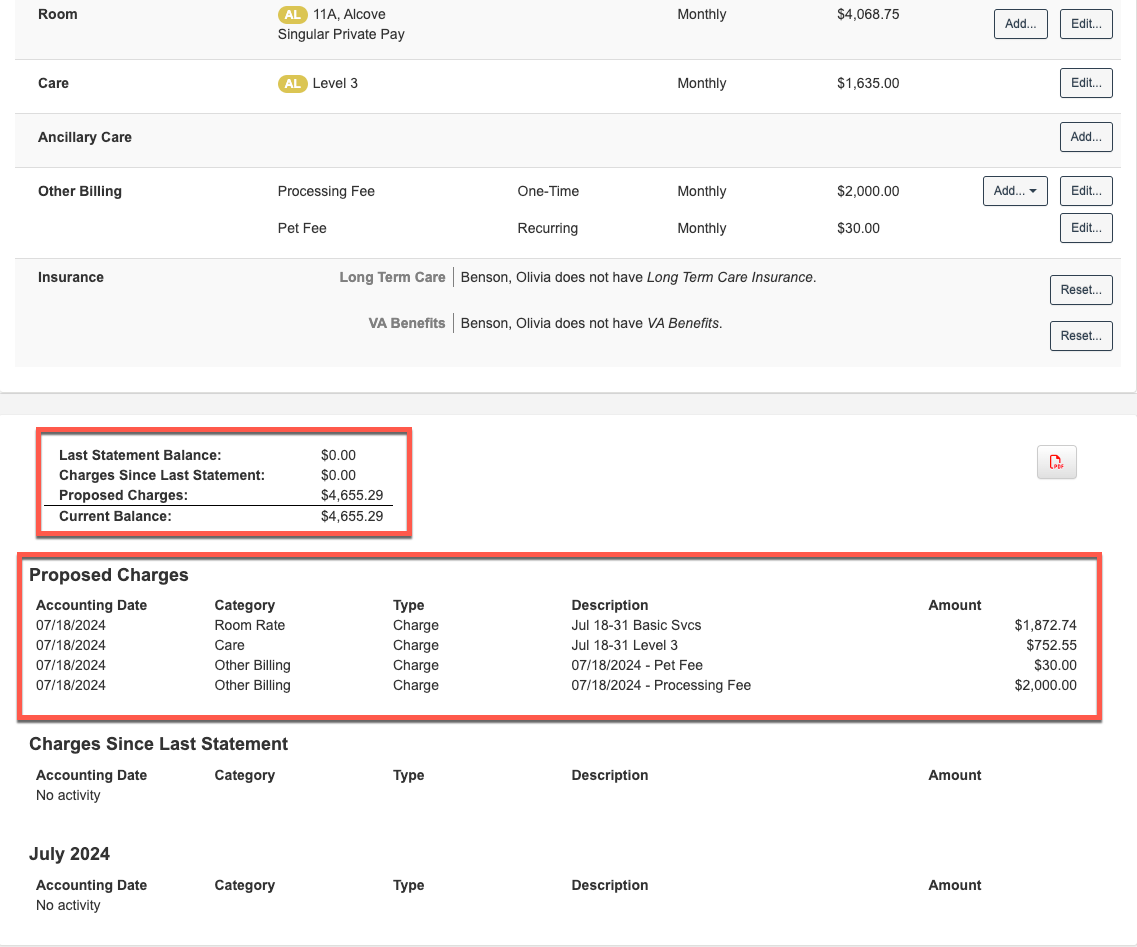 In the Proposed Charges category, both the full amount for room & board and monthly care services are being reserved. Moreover, a corrected amount from the start of the month to the move out date / bill to date has been charged instead. For example, the full room charge of $2,980.00 has been reversed and a corrected charge July 1st through July 18th has been charged at $1,763.51.