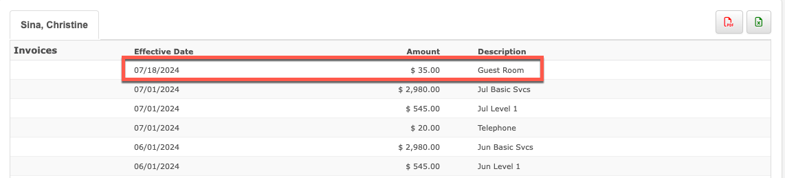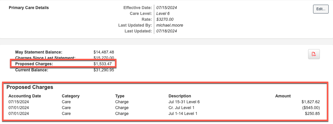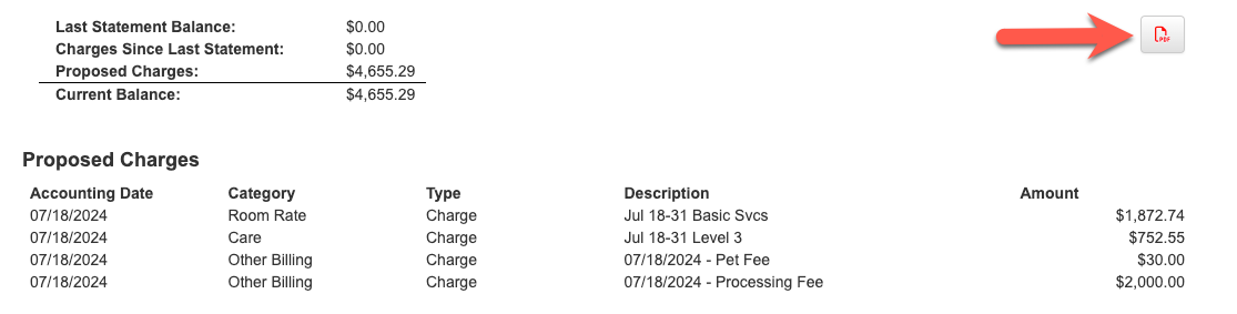 It's vital that the charges are thoroughly reviewed prior to processing the move in as the charges will automatically process into the resident's ledger without any further review or approval needed. A PDF of the proposed ledger can also be exported out of Aline Revenue by selecting the PDF icon highlighted in the photo above.