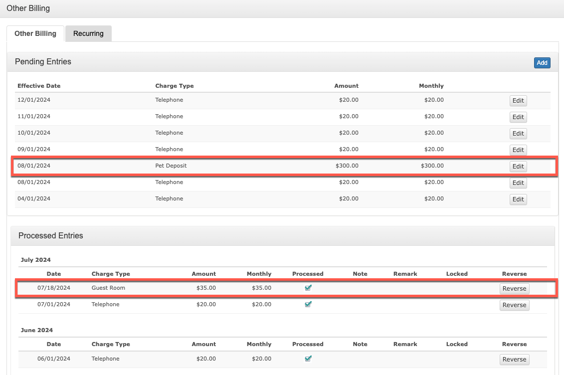 While Other Billing will not include a Proposed Ledger View like the previous functionalities, Other Billing has still be upgraded thanks to Real Time Billing. Now, based off of the Effective Date attached to the Other Billing item, entries with an Effective Date in the current accounting period will automatically process to the resident's ledger.