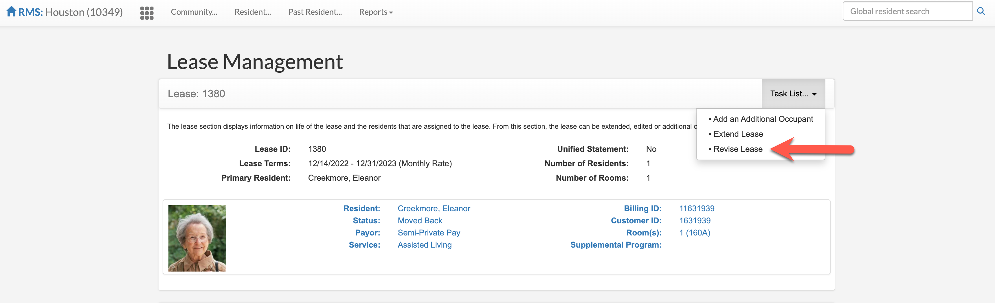 Step 2: At the top of the resident profile, under the Lease Management category, select the task list and then select Revise Lease.