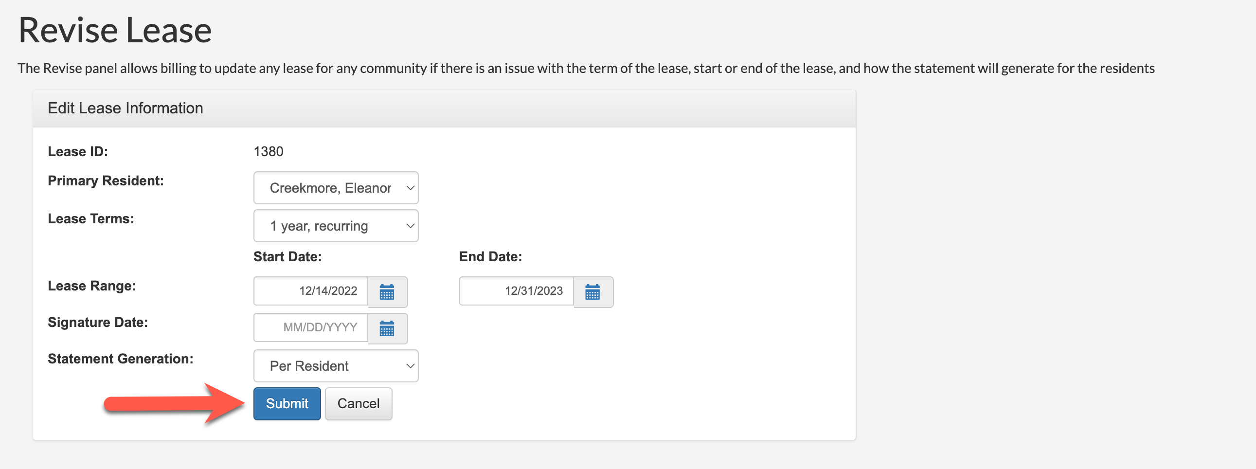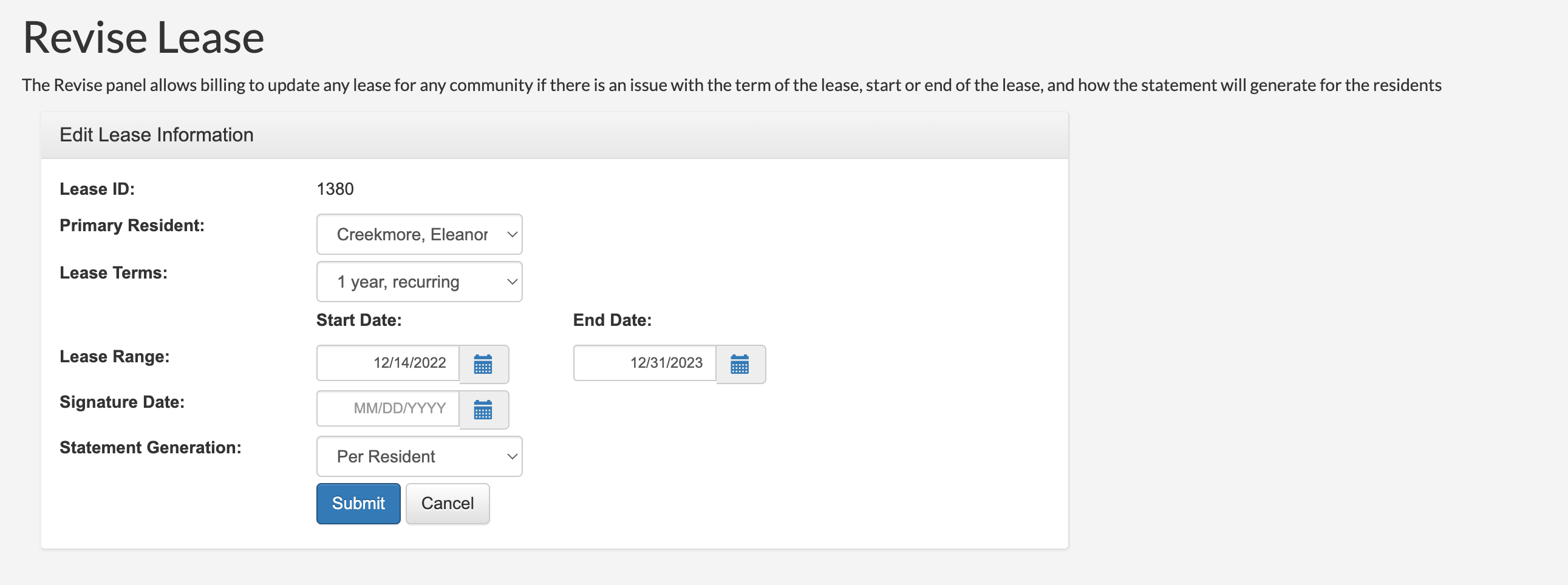 Revising a resident's lease allows users to change items like who the primary resident is, the specific lease terms, the range of the current lease, and whether the resident statement should be seperate or combined onto one bill (for leases with multiple residents).