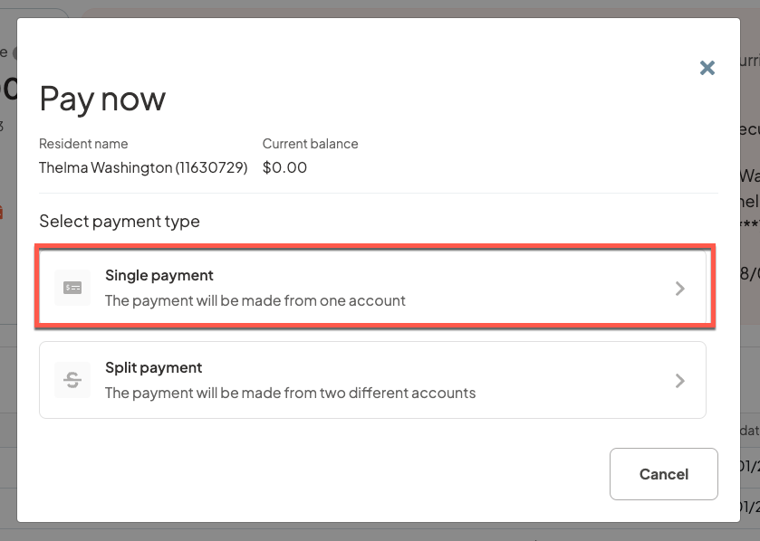 Step 2: Next, payors will select either 'Single Payment' to make a payment with one payor, or they will select 'Split Payment' to make a payment with two payors. In this example, we'll select 'Single Payment'.