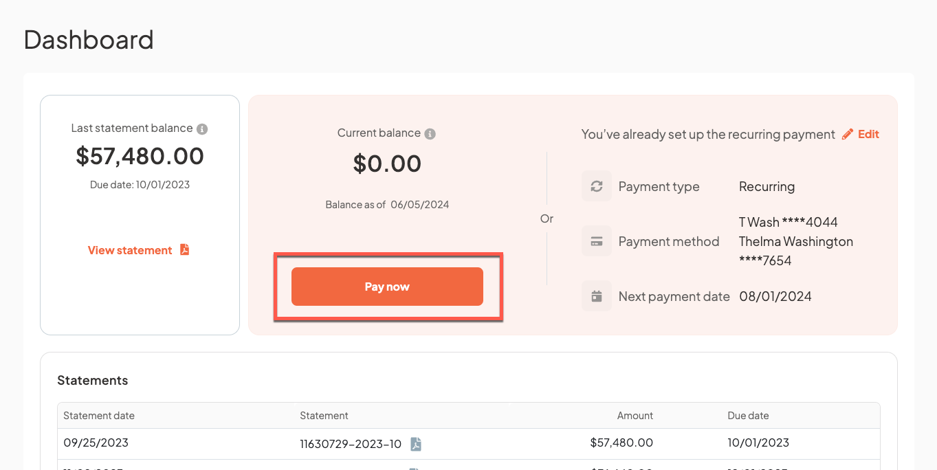 Step 1: After accessing the Express Pay application with the resident's information, users can select 'Pay Now' to enter in payment details. If recurring autopay payments have already been set up, those details will display to the right of the Pay Now button as pictured below.