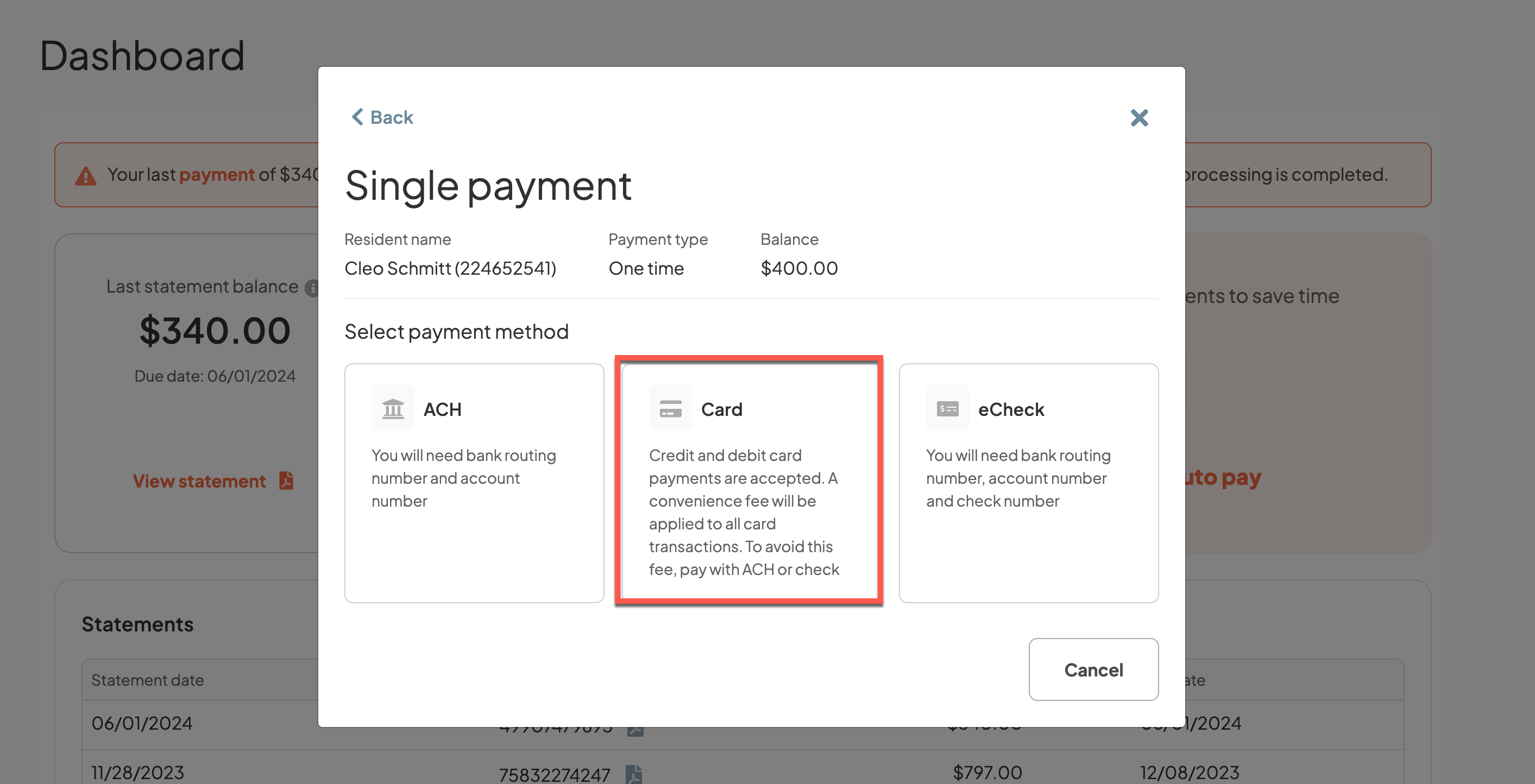 In this article, we will detail the required steps needed to make, or assist with, resident credit card payments in ExpressPay. Resident payments in Express Pay can be made by the residents themselves, resident payors, or with assistance by community business office users.