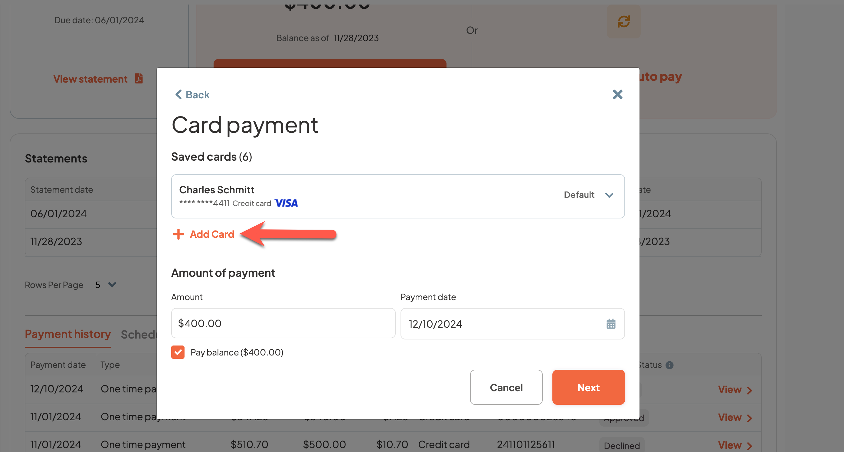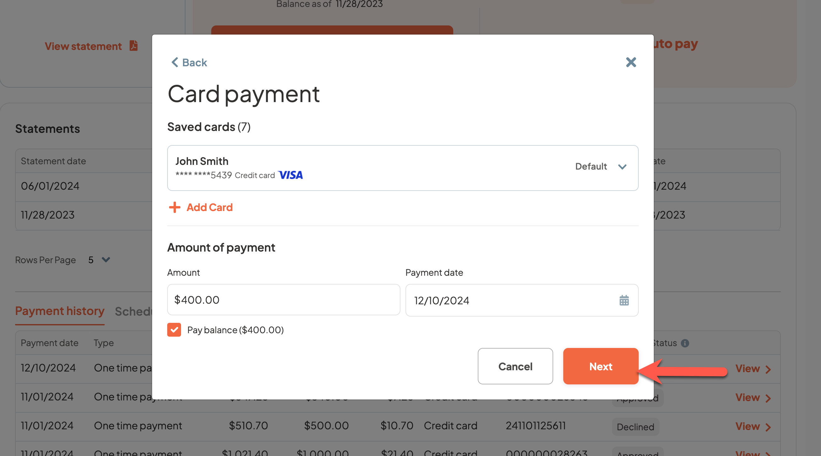 Step 5: After adding the new card, customize the payment amount if desired. By default, the payment amount will be set to pay the full resident balance, If a different amount is desired, unselect the Pay Balance checkbox and enter in the desired amount. Select Next.
