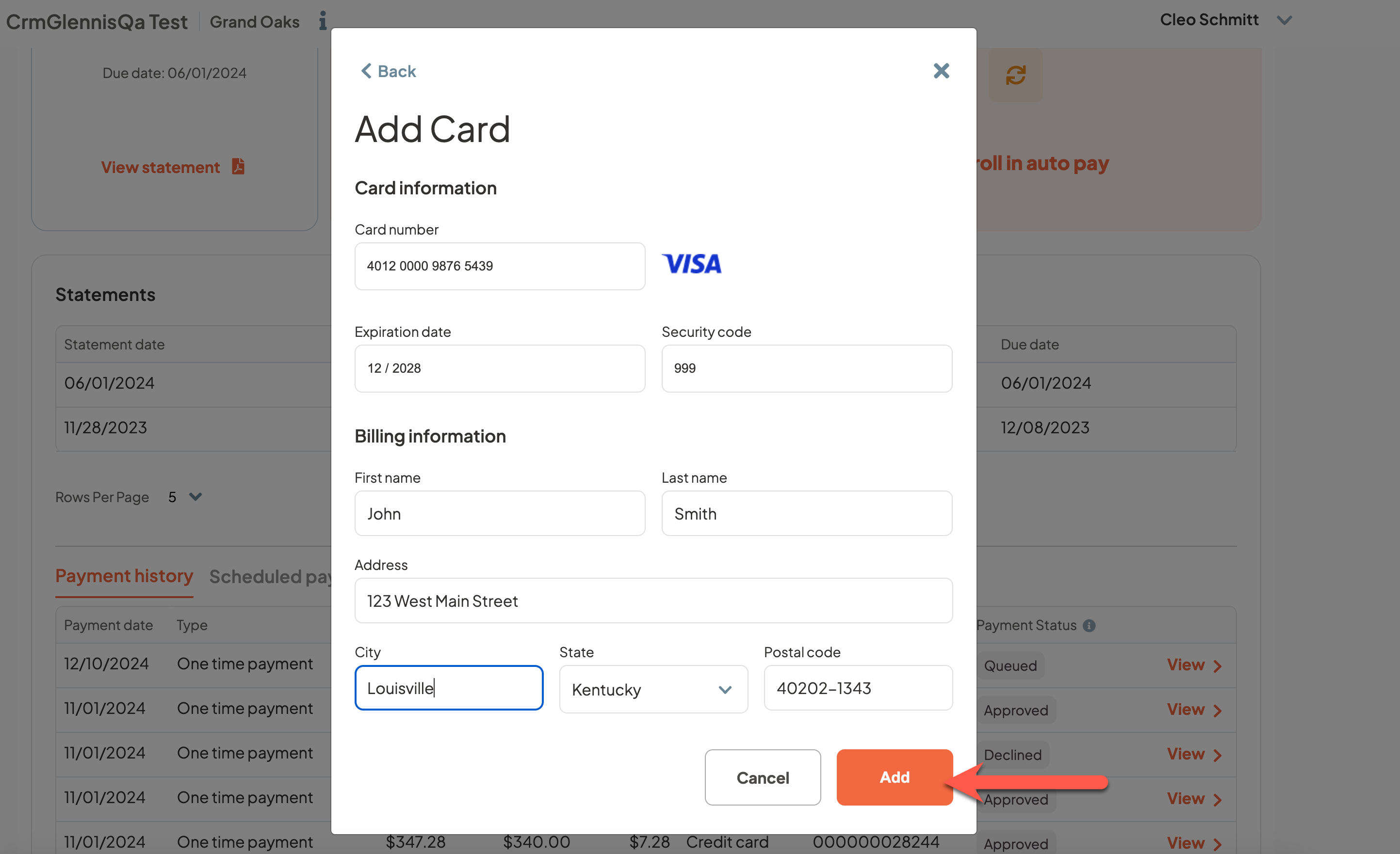 Step 4: After selecting + Add Card, add the required information including the card number, expiration date, security code, and billing information (first name, last name, address, city, state, and postal code). Finally, select Add.
