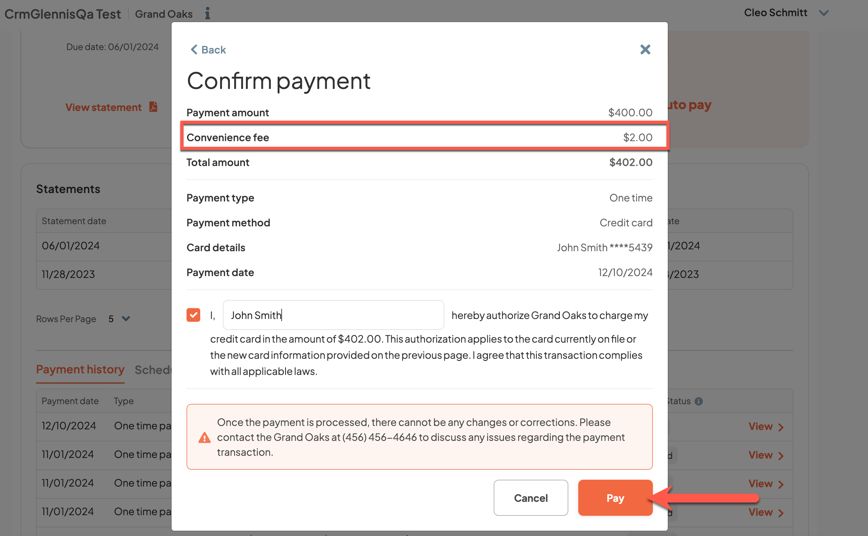 Step 6: Next, payors must fill in their name and select the checkbox to acknowledge and authorize the community to take their payment from their provided payment method. Select Pay.