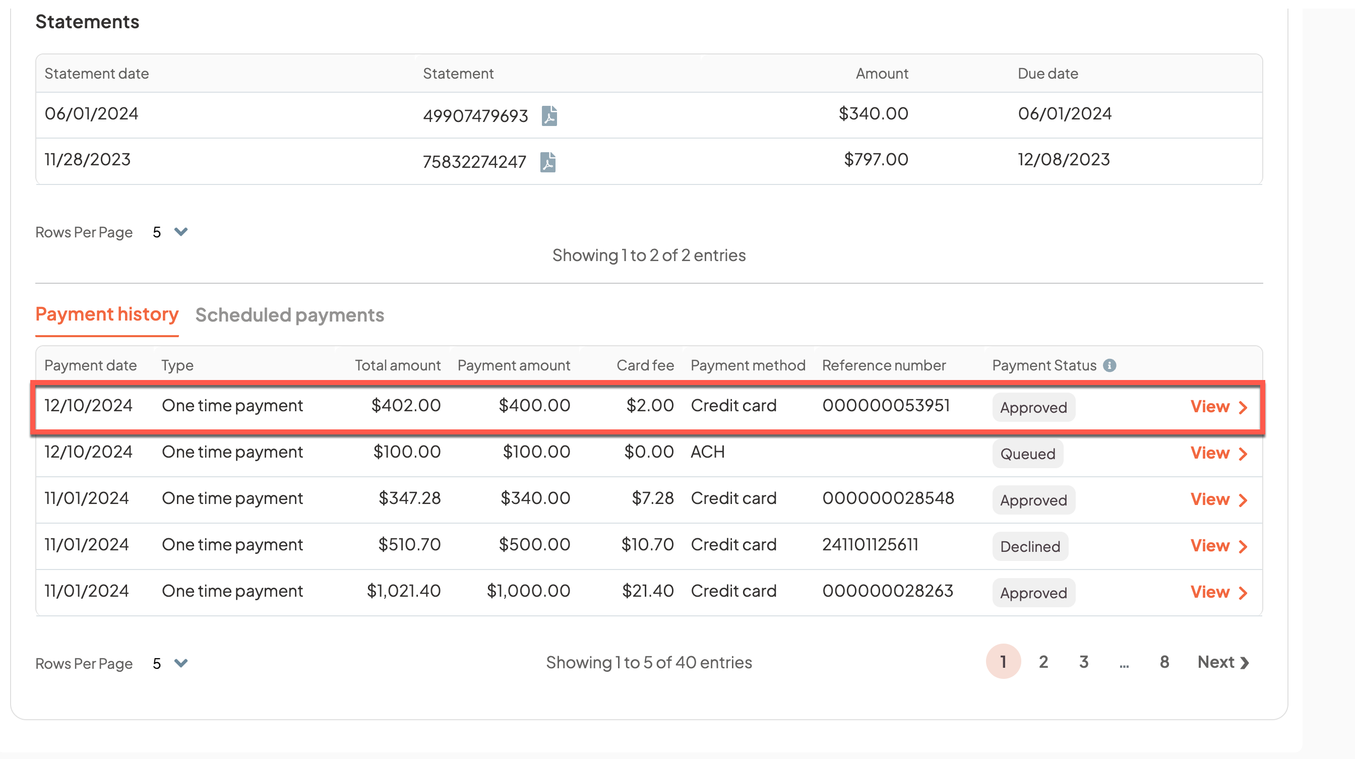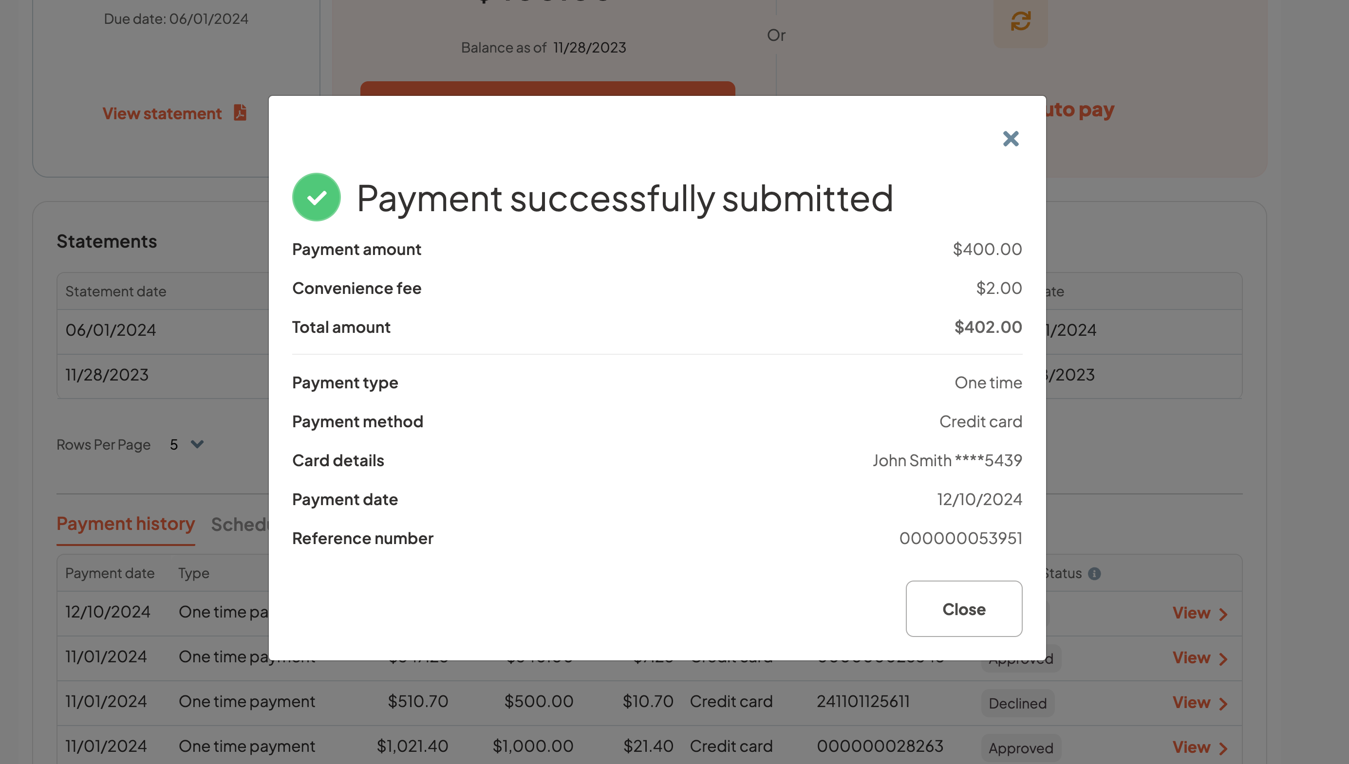 Step 7: A confirmation box will display. The payment will also display in ExpressPay on the resident dashboard under Payment History and in Aline Payments on the resident profile under Past Payments. Select Close.