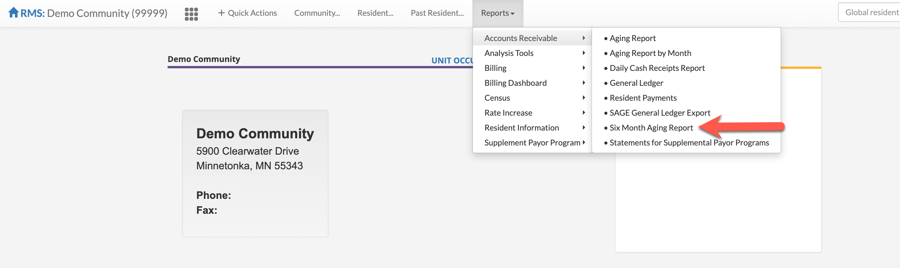 Step 2: Next, select Accounts Receivable and then select Six Month Aging Report.