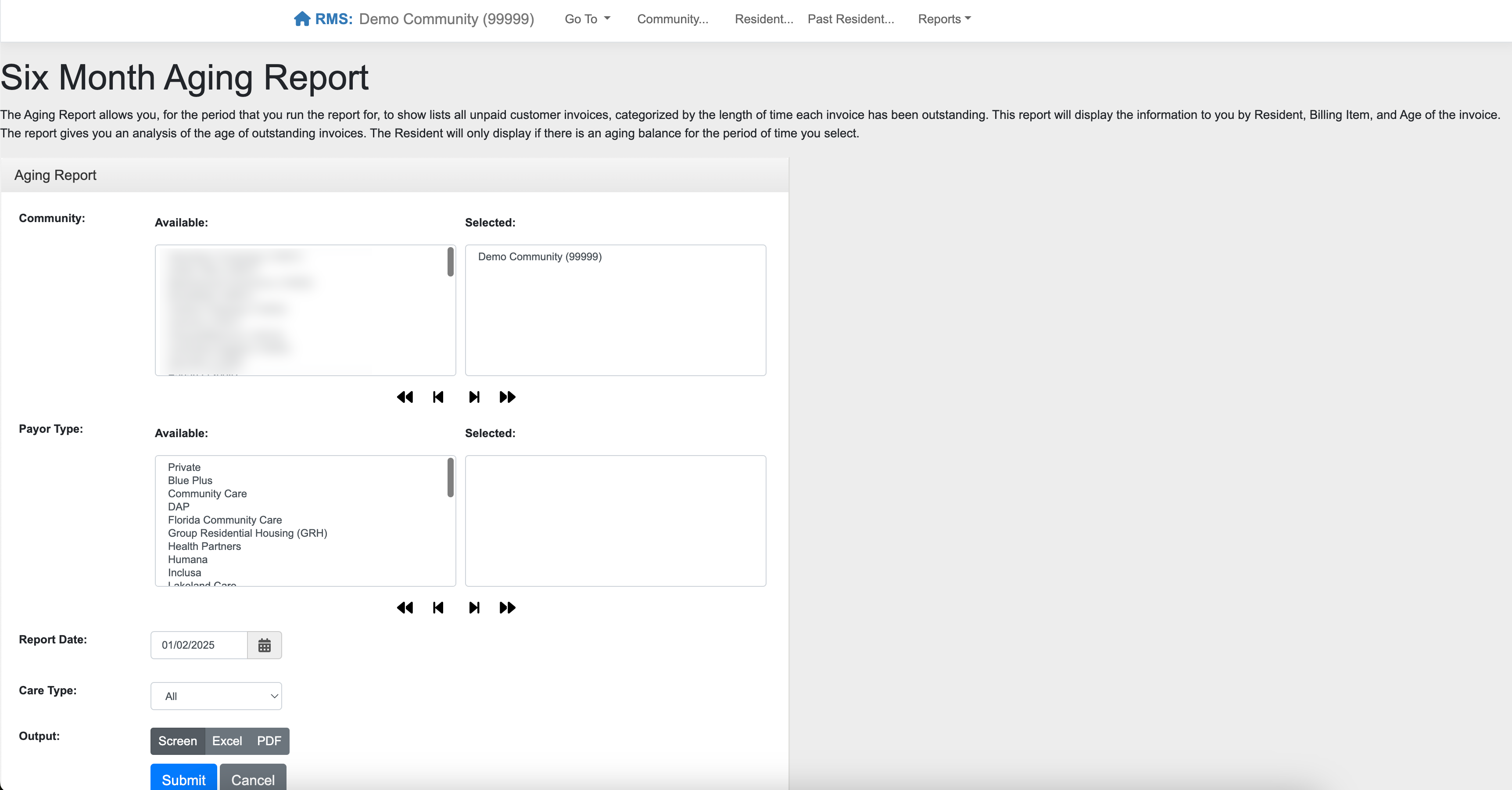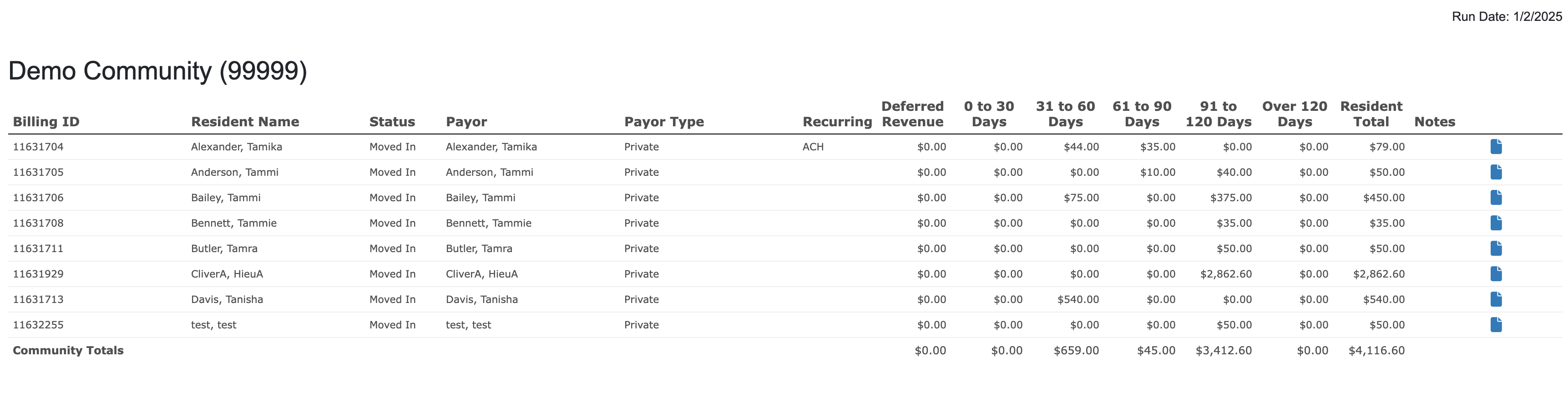 As the report header states, the Six Month Aging Report allows you, for the period that you run the report for, to show lists all unpaid customer invoices, categorized by the length of time each invoice has been outstanding. This report will display the information to you by Resident, Billing Item, and Age of the invoice. The report gives you an analysis of the age of outstanding invoices.