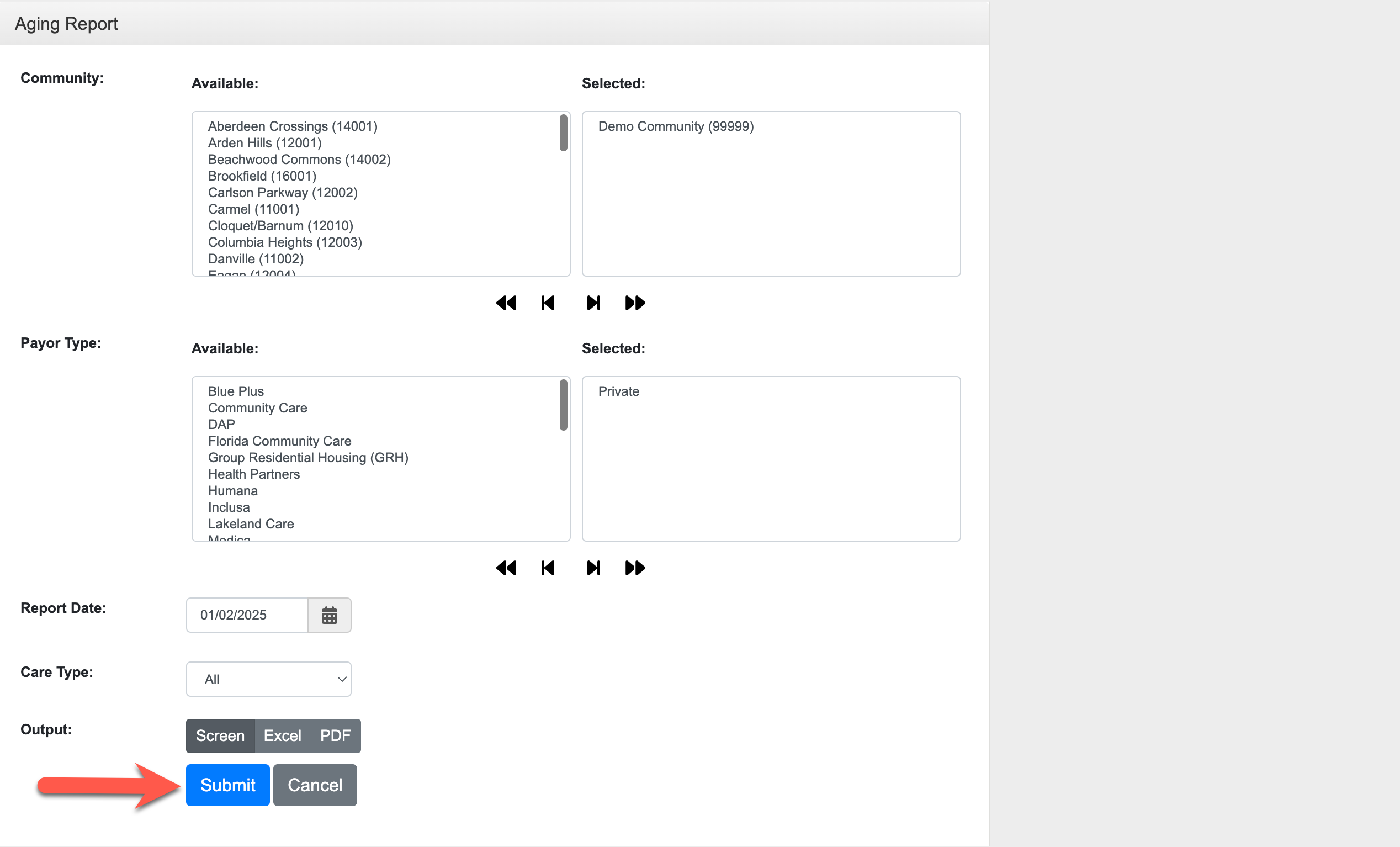 Note that Payor Type can be filtered as well. Reports can be run for specific Supplemental Payors, groups of Supplemental Payors, or simply by Private Payors only. If this field is left blank, all applicable fields will apply.