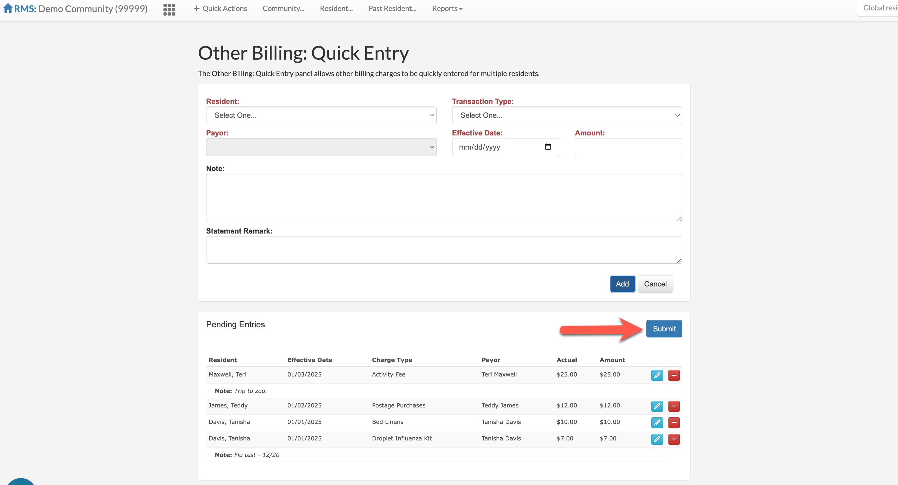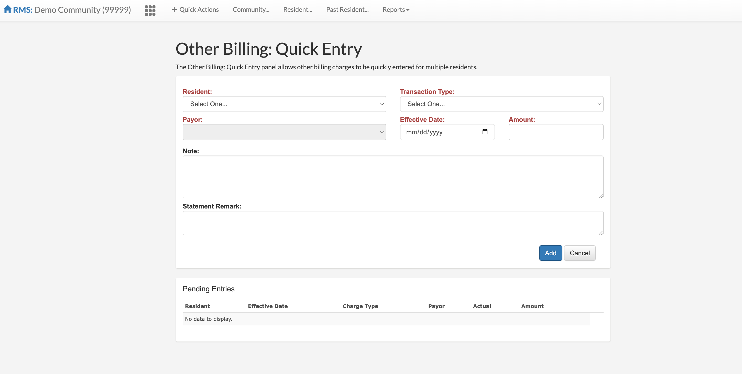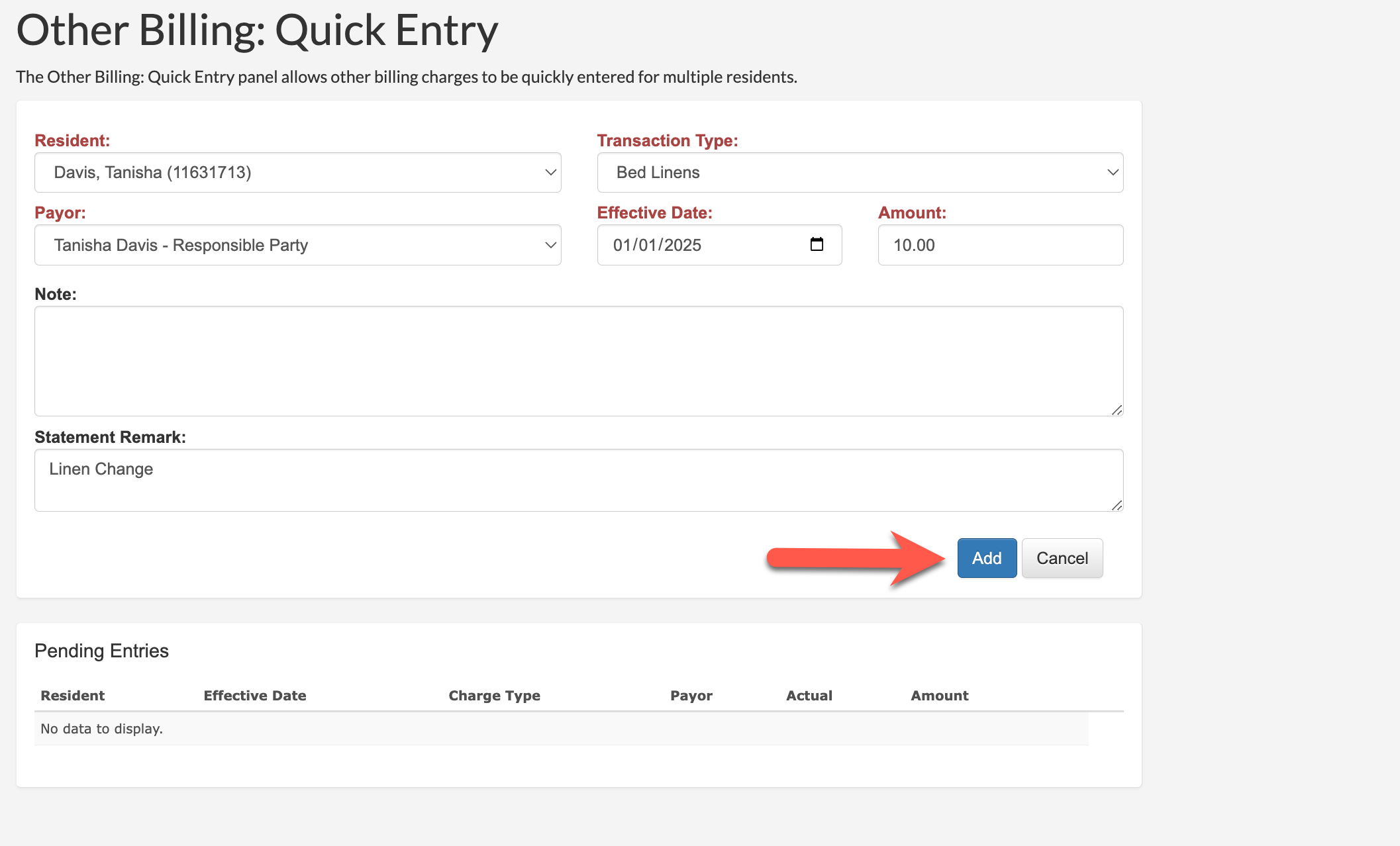 Other Billing, items outside the scope of a resident's room & board and care services, can be added to a resident's ledger by accessing the Other Billing tool located on their resident profile. However, if many Other Billing items need to be added to multiple residents, the most efficient way to do so is with the Other Billing Quick Entry tool.