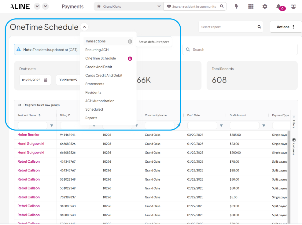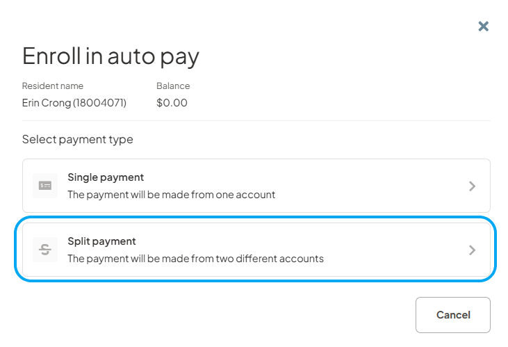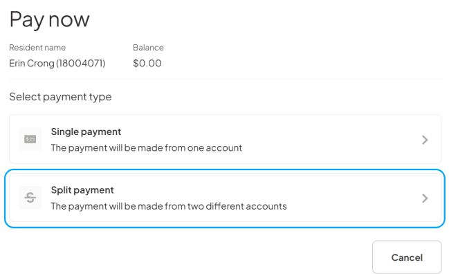 Users can now split a single payment transaction, including one-time and recurring payments, across two separate dates. Users can now split a one time payment transaction and recurring payments across two dates with its own payment date (based on tenant configuration and acceptable dates for the community.