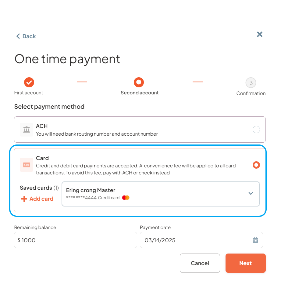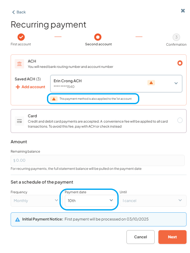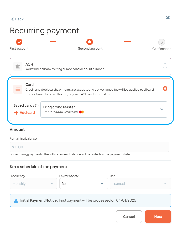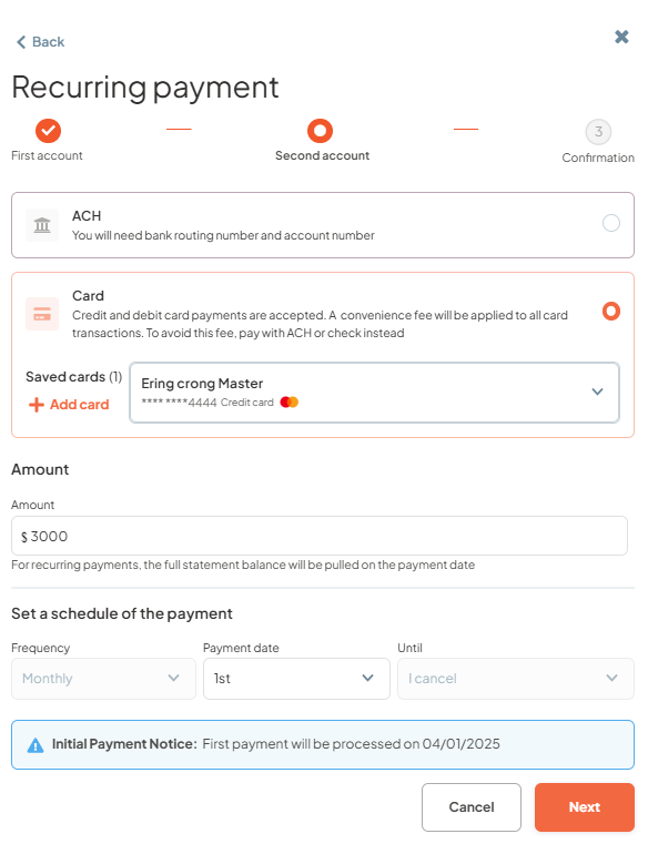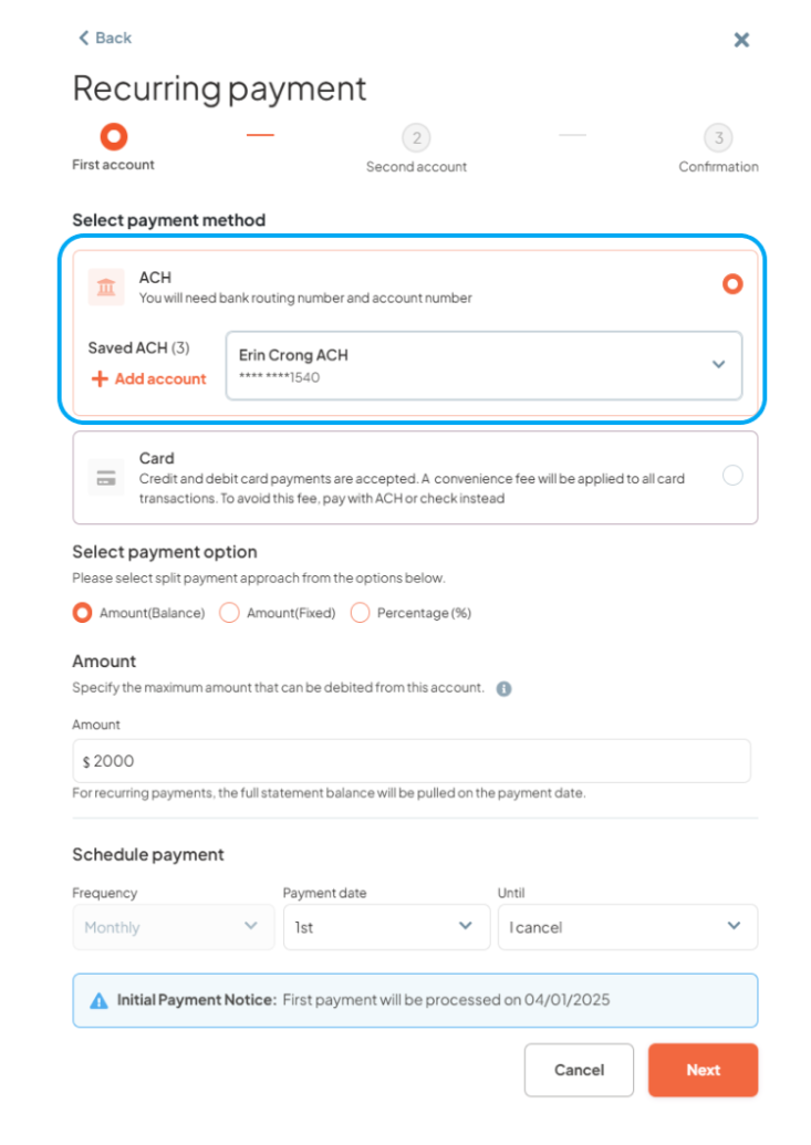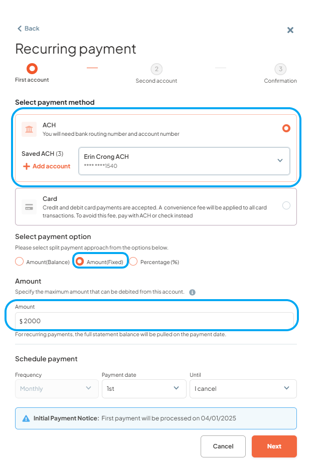 - Step 3: Select ACH, Credit, or Debit card as the first payment method, select “Amount fixed”, enter the payment amount, specify the payment date, and then click "Next".