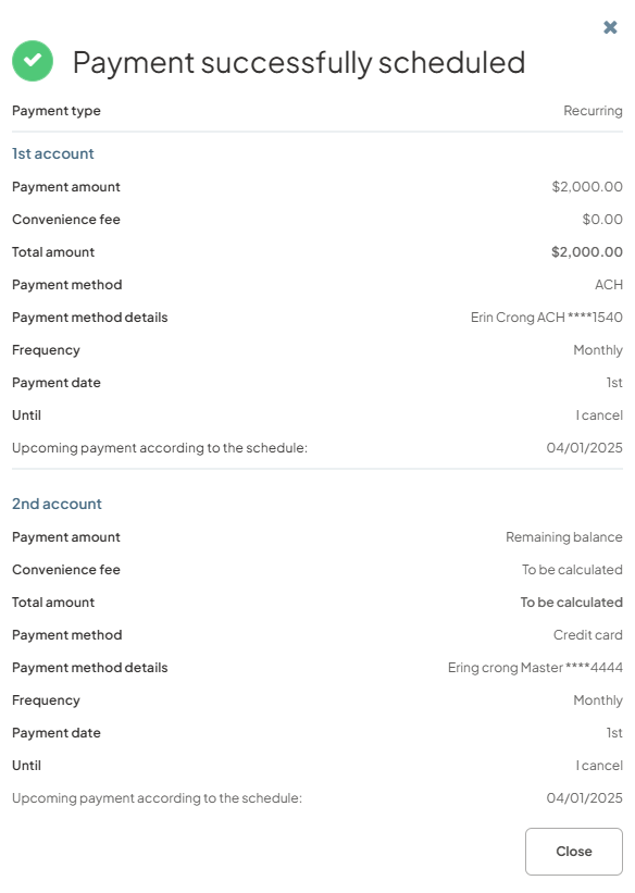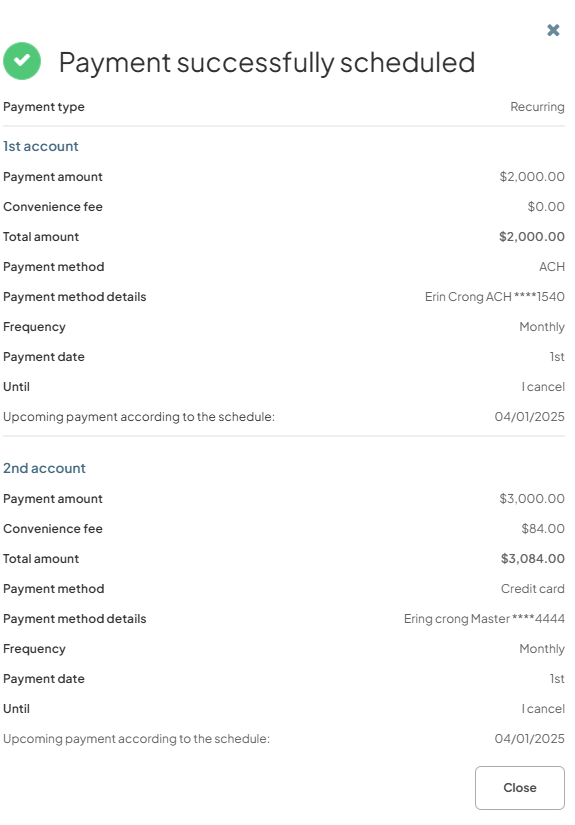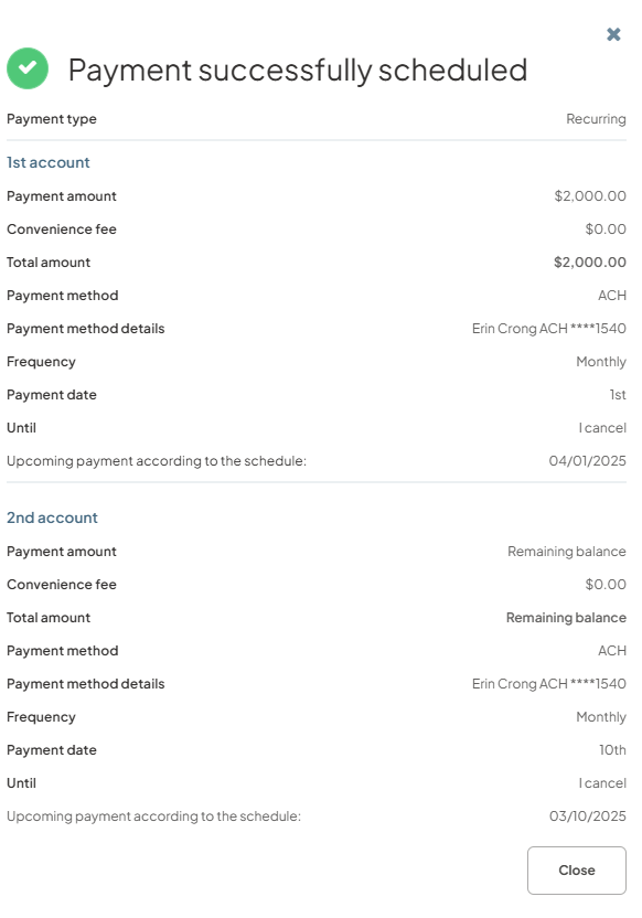 Users can now schedule fixed draft amounts for recurring payments from one or two accounts. This feature enables users to set up recurring payments that draw predetermined amounts from either a single account or split between two different accounts.