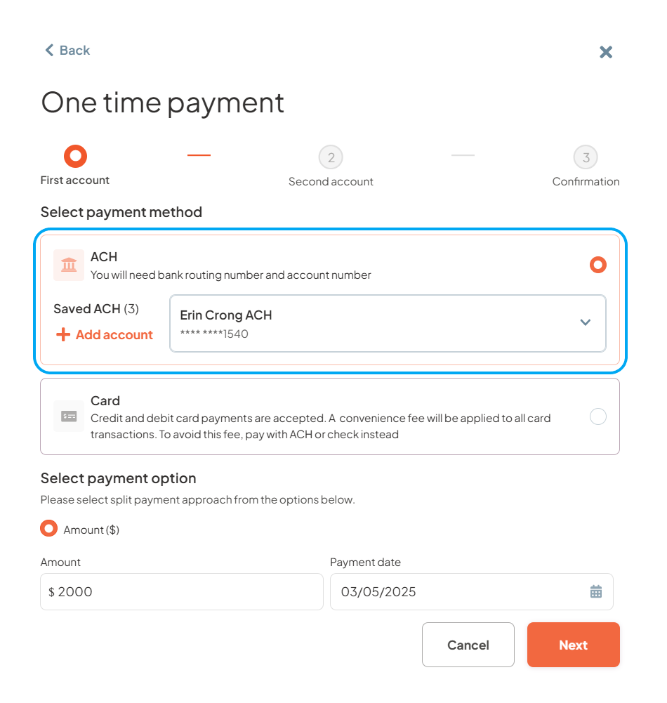 - Step 3: Select ACH as the first payment method, enter the payment amount, specify the payment date, and then click "Next".