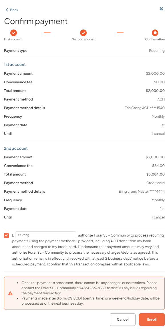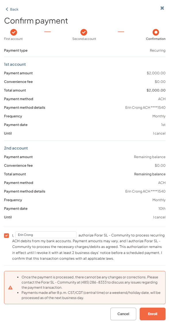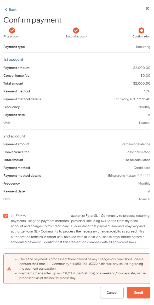 - Step 5: Review the payment confirmation screen to ensure everything is correct and provide payment authorization and clin on Enroll.