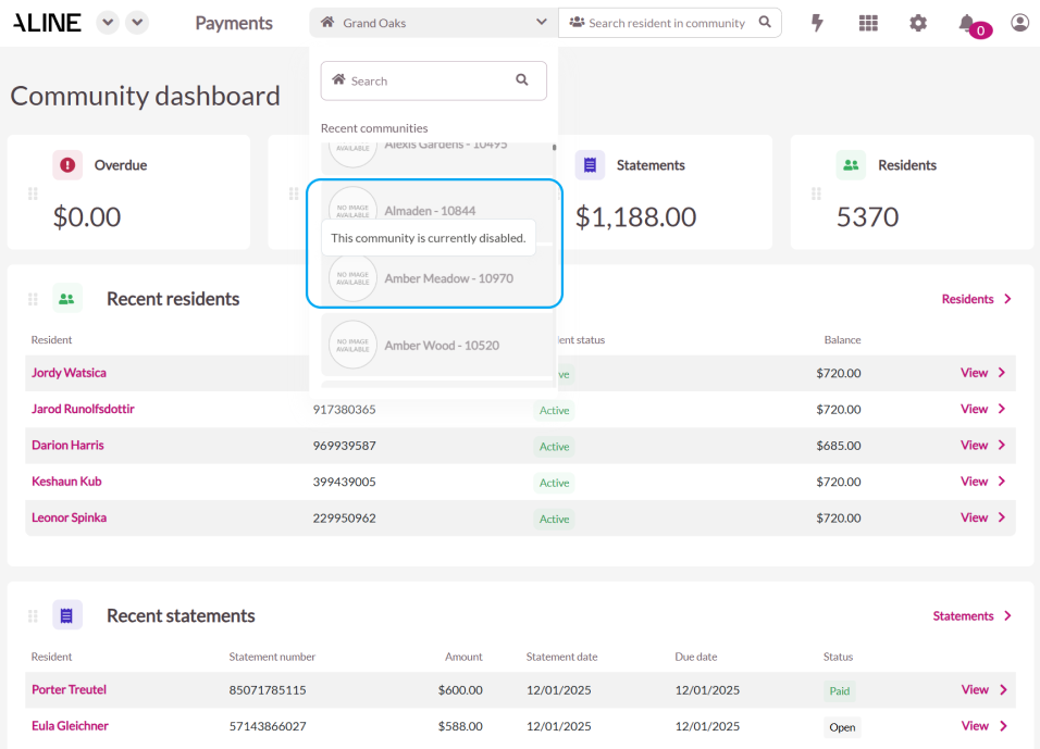 Disabled and deactivated communities are now greyed out in the Business Portal allowing users to differentiate between active and inactive communities. This feature provides users with a clear visual distinction between active and inactive communities, making it easier to manage and navigate the portal. Disabled communities are displayed in a greyed-out state, indicating that they are inactive. Users can still view historical information for these communities.