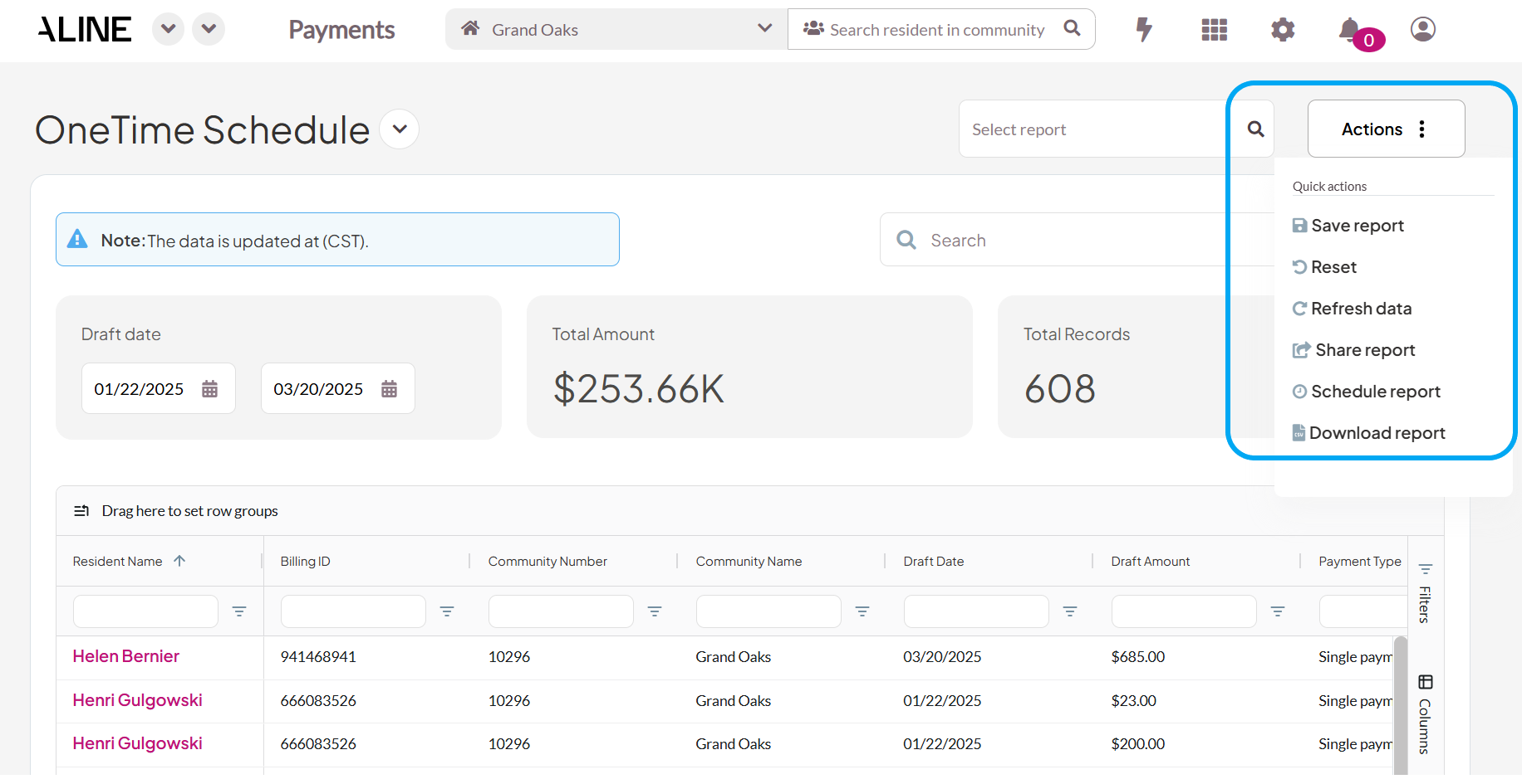 - Step 4: To access additional report options, users will click the three dots next to the "Actions" button. This menu allows users to save, download, share, schedule automated delivery, refresh, or reset your reports.